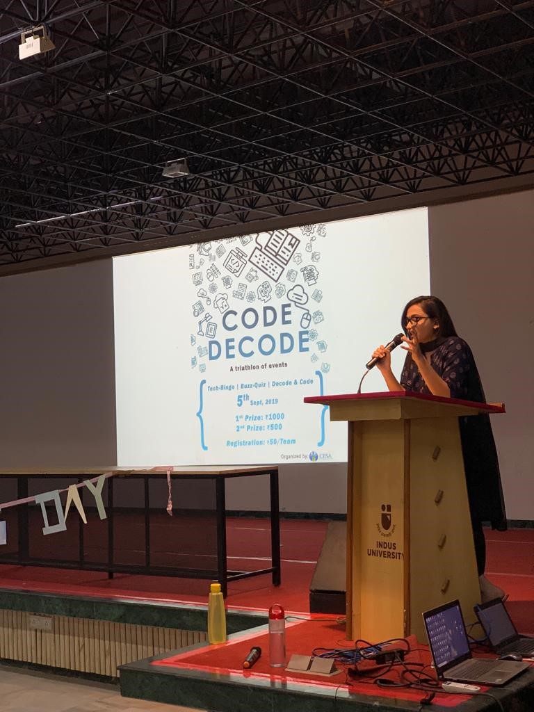 On Teacher’s Day, a triathlon of events – Code Decode was organized by the CE department. The event started with Saraswati-Vandana and words about Dr. Sarvepalli Radhakrishnan by Vidhi Parikh. Student coordinators of CESA, under the guidance of Prof. Srishti Sharma, organized the event.