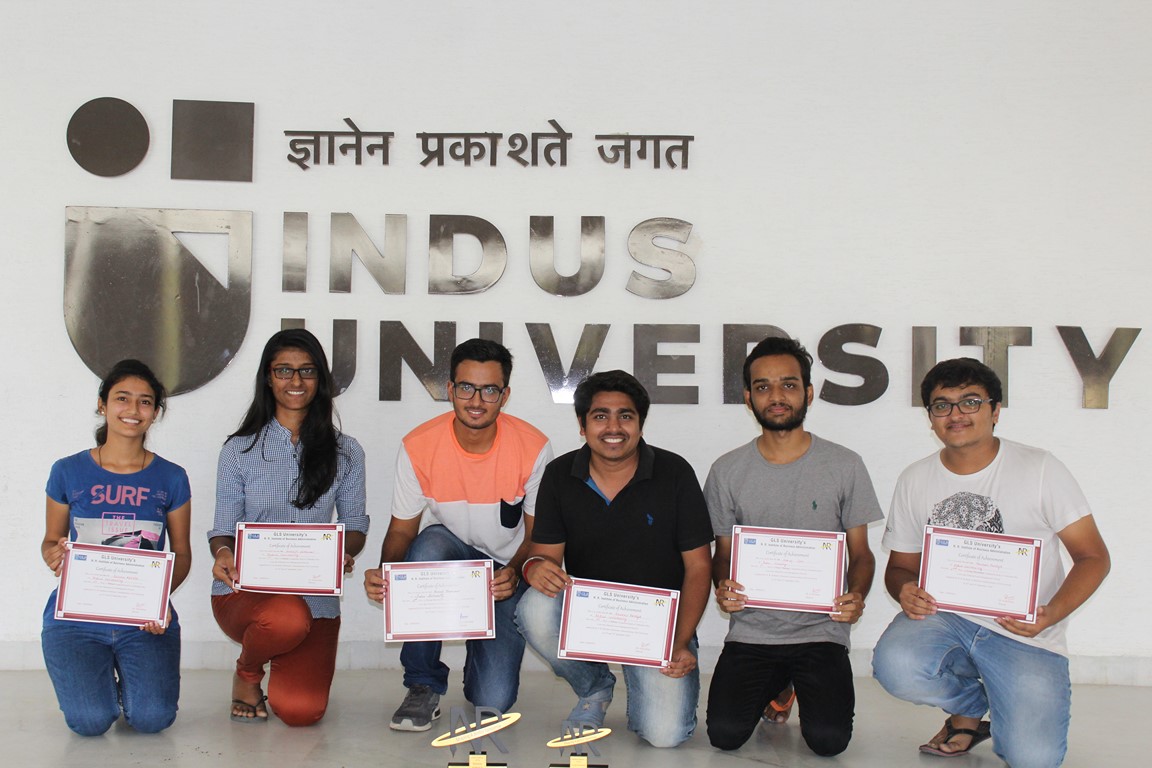 Mastering others is strength however mastering yourself is true power. This seems to be the adage students of Indus University that led to their second consecutive win at Vishleshan Plus 2016, a two day National Level Management Festival organized by N.R. Institute of Business Administration at GLS University on 15th and 16th September’16. Last year Gaurav Pandya (7th Sem, Metallurgy) secured third position in Debate competition however this time he along with Krima Rohela(3rd Sem,EC) and Aakash Bherwani(5th Sem, Mechanical) stood first, beating all other teams from various colleges of Ahmedabad. The Poster competition was aced by Nikunj Patel (7th Sem, Mechanical) with his spectacular poster on Make-in India theme. Other self-motivated individuals include Ruturaj Gadhavi (7th Sem, Civil) who cracked the Elimination Round and participated in the Finale of Solo Singing(Filmy category) and Miti Desai(1st Sem, IT) who participated in Sneakers Painting competition. An interesting range of workshops was organized during this two-day event, in which Gaurav Pandya and Maulik Vaishnav participated in the Creative Writing and Public Speaking workshops. Under the able guidance of Ms. Mamta Amin, Faculty Coordinator from Science & Humanities Department, these representatives of Indus University were successful in their endeavor to bring a good name to the institution.