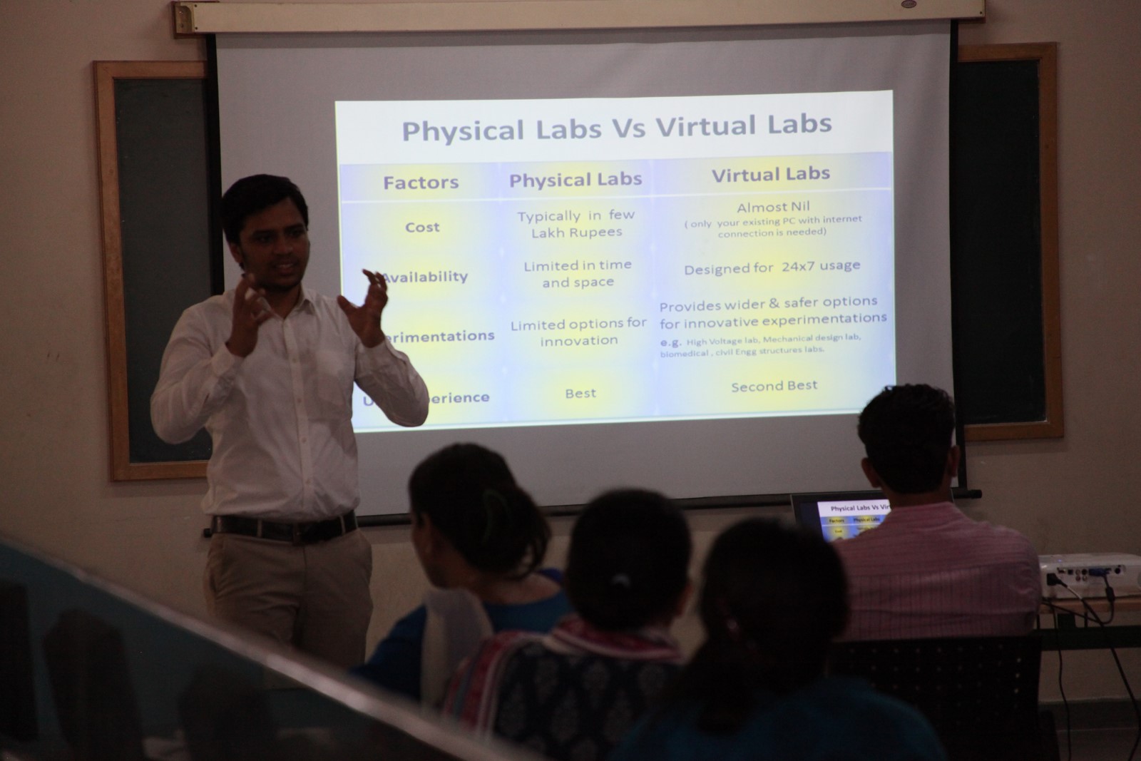 Virtual Lab is an initiative by the Ministry of Human Resource Development (MHRD) under the national mission of education through ICT. Since IITE at Indus University has been included in the list of nodal centers of Virtual Labs, a workshop on Virtual lab to create awareness on its usability was organized on 27th May 2017 in which 25 faculty members had participated. The main objective is to provide remote-access to labs in various disciplines of Science and Engineering which will cater to undergraduate and post graduate students.