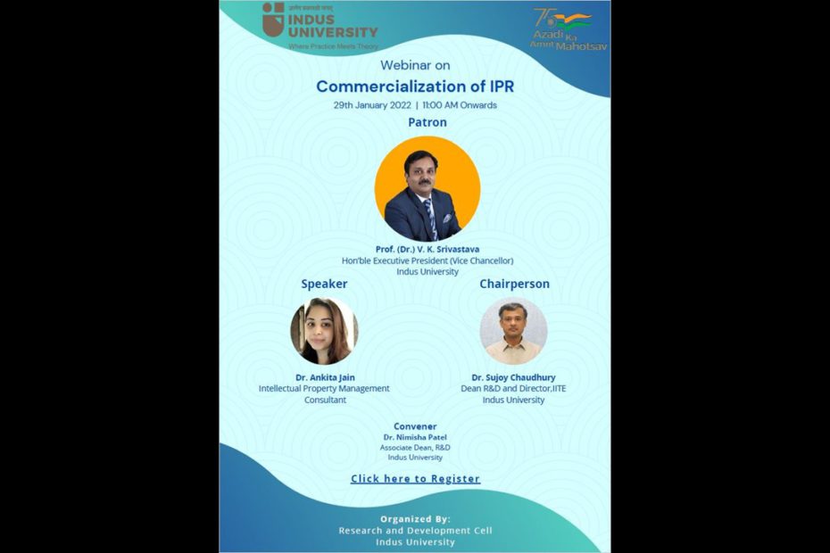 The Research and Development cell, Indus University invites you to participate in a Webinar on “Commercialization on IPR” organised on 29-01-2022 from 11:00 AM to 1:00 PM. Commercialization of IPRs refers to doing business with intellectual property, i.e. some inventions, which are protected under the IPRs, through some sorts of business