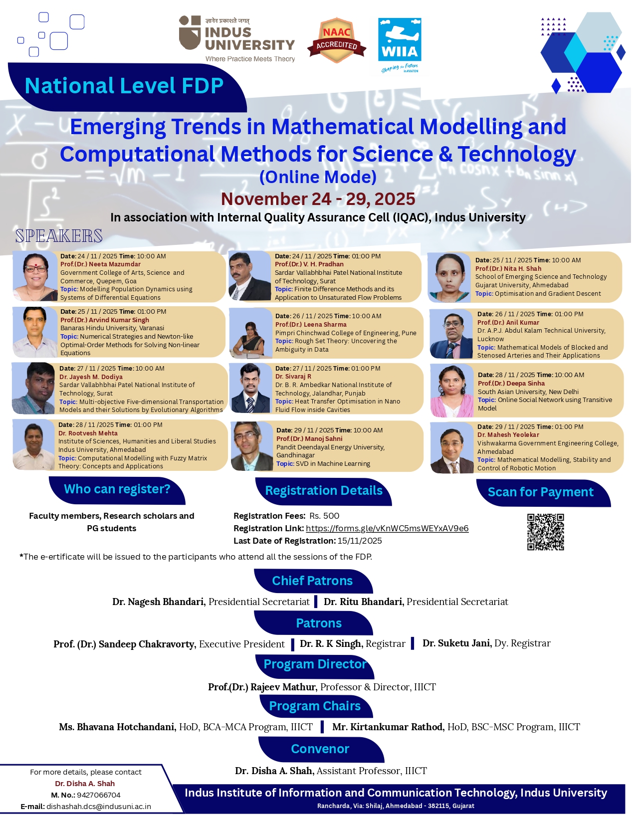 Indus University brings an engaging FDP on “Emerging Trends on Mathematical Modelling and Computational Methods for Science and Technology”. Join expert academicians and upgrade your knowledge in advanced modelling & computational techniques! Dates: 24–29 Nov. 2025 Mode: Online Fees: ₹500 Last Date : 20 Nov. 2025 Payment Link: https://pay.webfront.in/webfront/#/merchantinfo/indus-university/8170 Registration Link: https://forms.gle/yxUEj99Y1hgnQwJP6 E-certificates for participants!