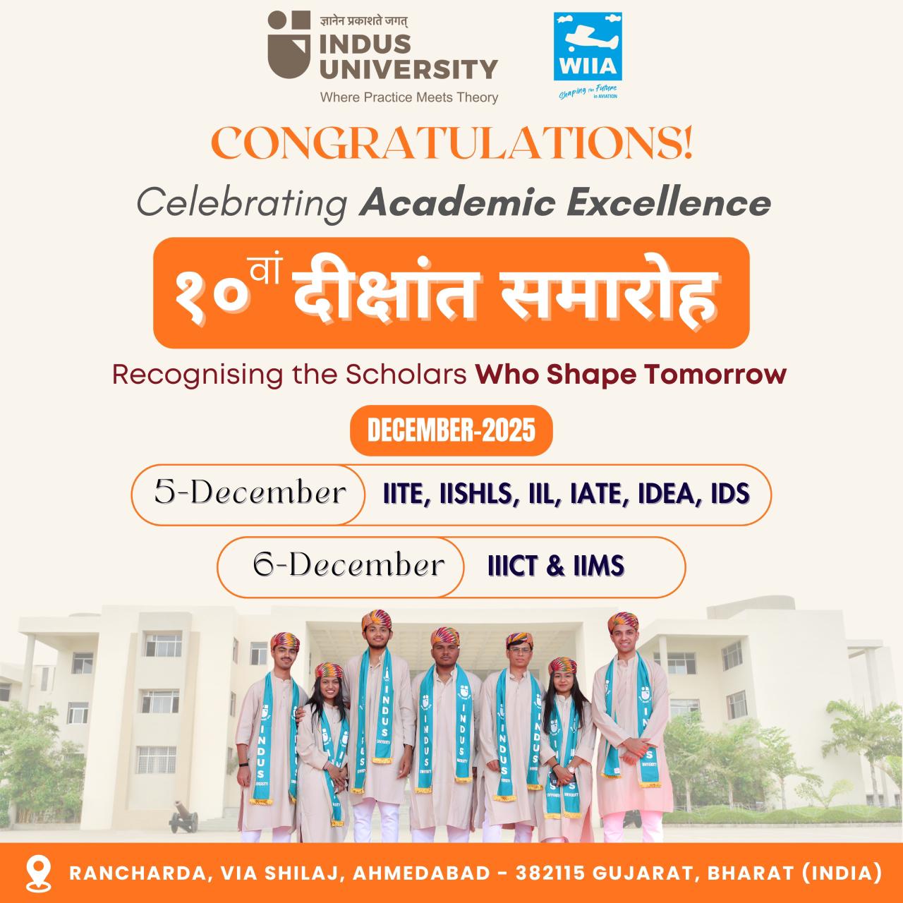 10th Convocation Ceremony of Indus University will be held on December 05, 2025 for (IITE, IISHLS, IAS, IDS, IATE, IIL) & December 06, 2025 for (IIICT, IIMS).